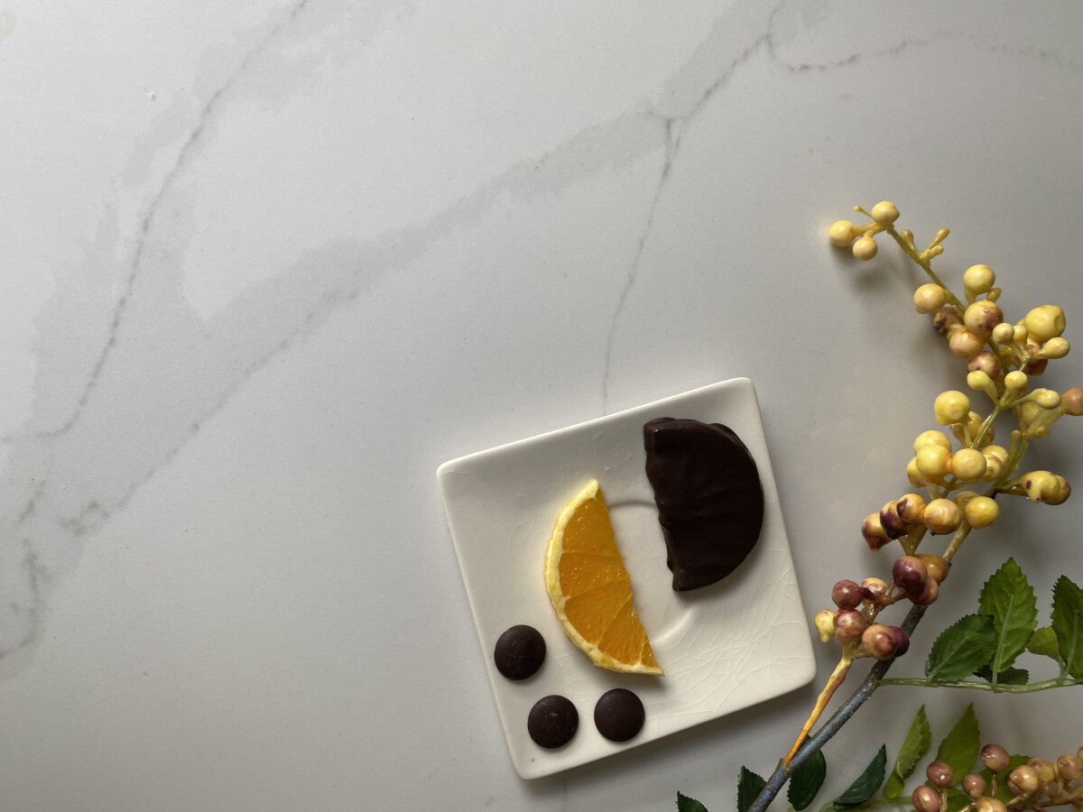 – Xocofruit naranja: naranja confitada y cubierta de chocolate puro